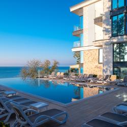 Отель соответствует 3* и не более. Номера старые, мебель разваливается. Питание, как в советской столовой. Все простенько и половина не вкусно. Повара ходят важнее губернатора, что спросишь, отвечают с гонором. Бассейн большой, да классный, НО летом не протолкнуться, помимо отдыхающих в отеле, пускают с улицы, постоянно тренировки спортшколы. Дети и тренеры занимают 3-5 дорожек для своих индивидуальных тренировок. Гостям отеля плавать негде, дискомфорт. Вокруг бассейна сгнившие доски, прикрытые зеленым ковром. Шезлонги без матрасов. Полотенца настолько короткие, что сидишь практически на голой сетке. Нужно брать 2, чтобы хоть как-то застелить. На пляже шезлонги вообще из твердого пластика - жесть. Кроме входной группы и близостью к пляжу - .хвалиться нечем. Море часто в волнах и грязное.